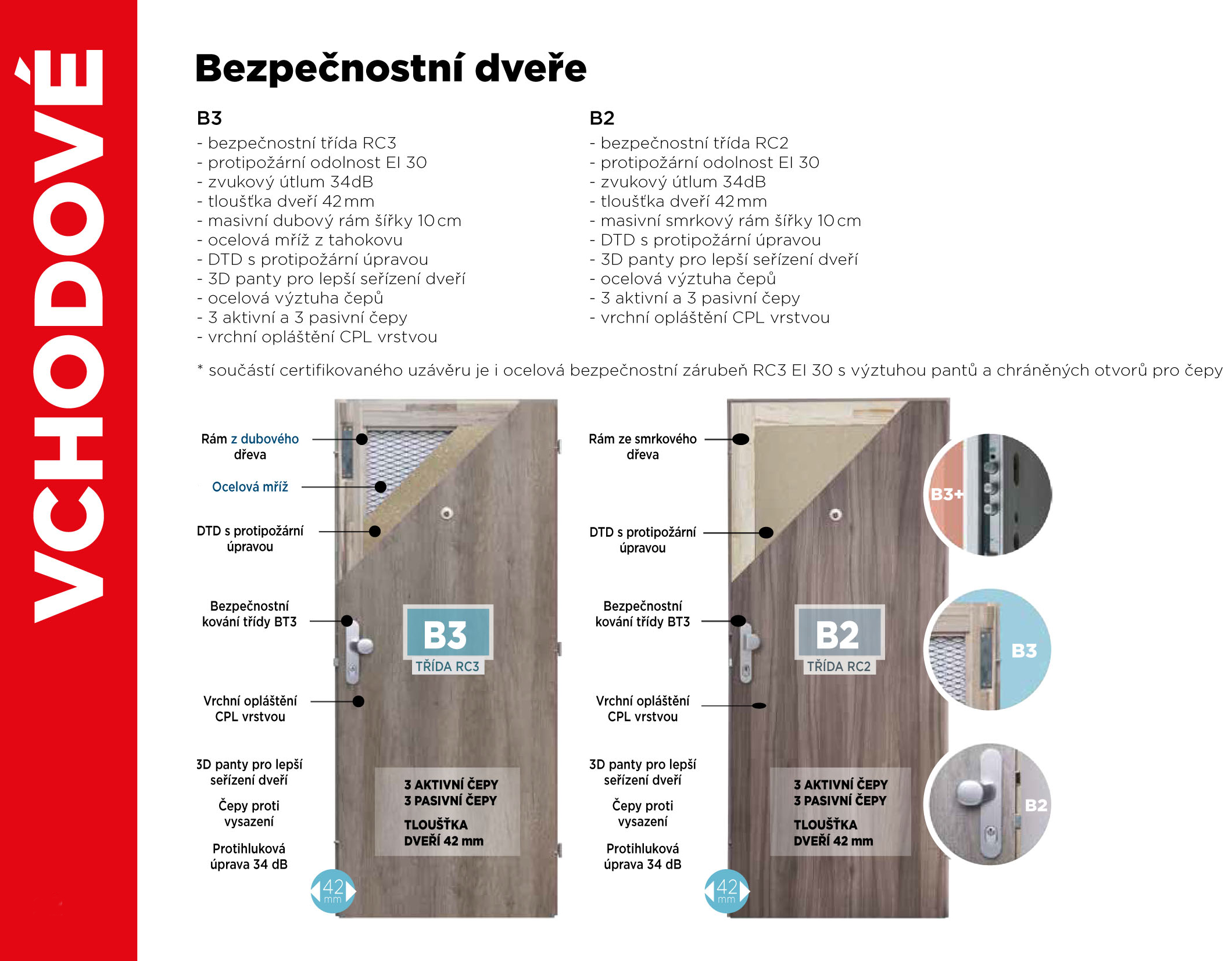 Dveře jsou vyráběny z kvalitního materiálu v několika bezpečnostních třídách a více než 30 barvách v materiálu CPL a HPL. Dveře mají protihlukový útlum 34dB a jsou certifikováné. Pro bližší informace klikněte na obrázky níže.